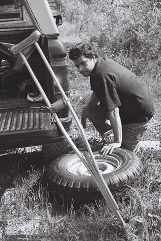 his shoulder was still in a sling, he got a flat tire, and no one would